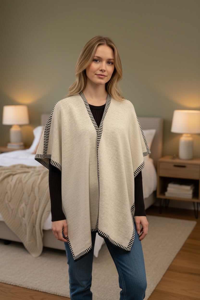 Capa para Dama cuello V abierto con dibujo en orilla en contraste. Composición: 100% Acrílico Tacto Cashmere.
