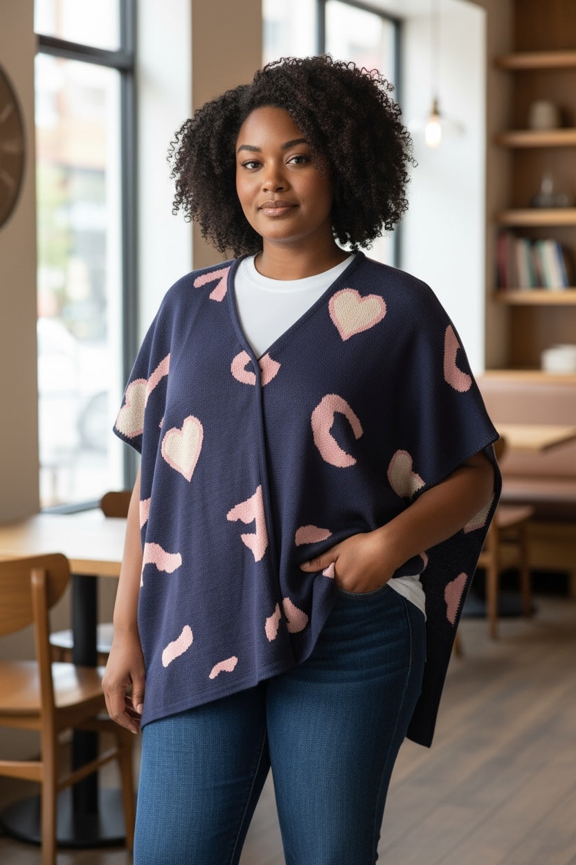 Capa para Dama cuello V abierta animal Print de corazones. Composición: 100% Acrílico Tacto Cashmere.